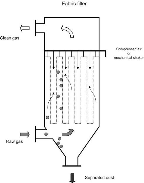 - The particulate matter then falls to the bottom of the chamber, where it is collected in a hopper or a bag filter.