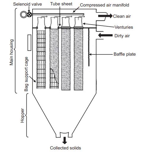 The particulate matter that is collected on the bags can be periodically removed by a process called "pulsing." During pulsing, a burst of compressed air or reverse air is introduced into the bags, which causes the particulate matter to fall off the bags and into a hopper or receptacle at the bottom of the chamber for disposal.