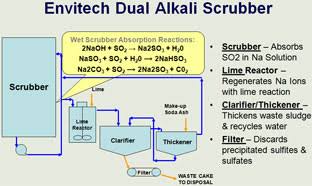 In single alkali scrubbing, the flue gas is passed through a spray of a solution of an alkali, typically lime (Ca(OH)2) or soda ash (Na2CO3) which reacts with the SO2 to form calcium sulfite (CaSO3) or sodium sulfite (Na2SO3) respectively. The flue gas is now cleaned and released into the atmosphere, and the scrubbing solution containing calcium sulfite or sodium sulfite is sent to settling tanks for separation. The solid particles are then removed and the scrubbing solution is recycled.